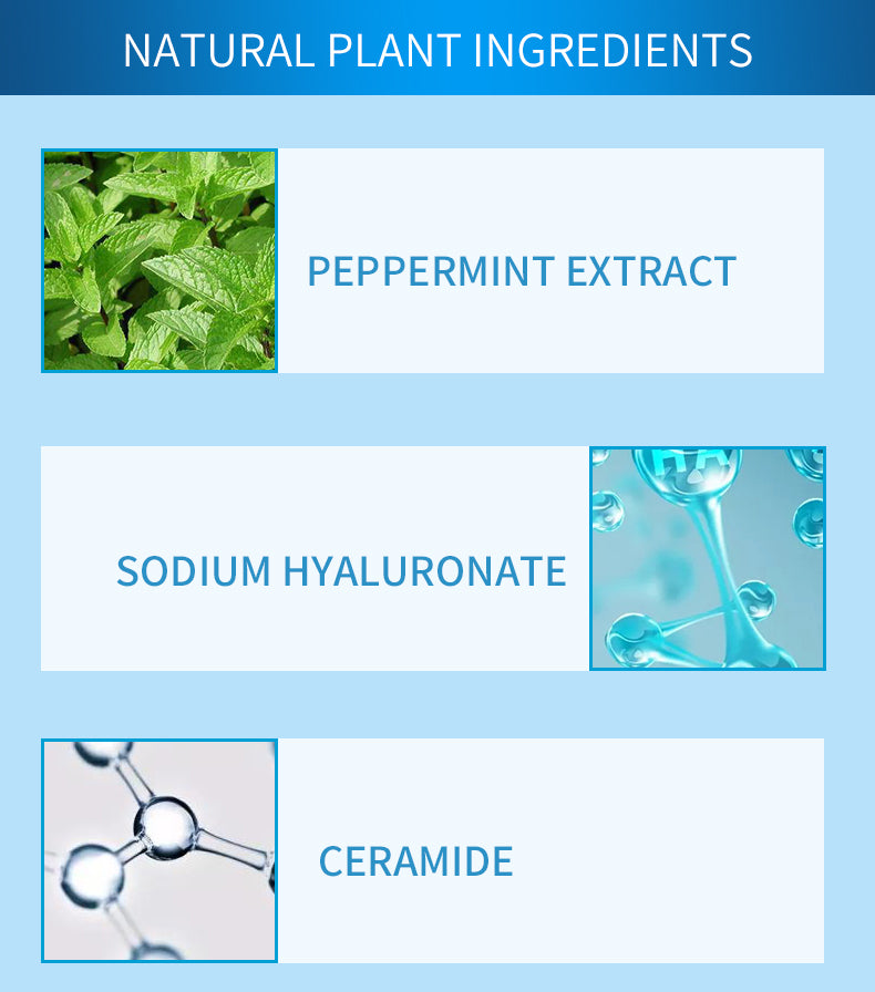薄荷提取物: 提供清凉感和舒缓效果,舒缓肌肤不适,提供清爽体验。透明质酸钠: 提供深层保湿,增加皮肤弹性,使皮肤光滑柔软。